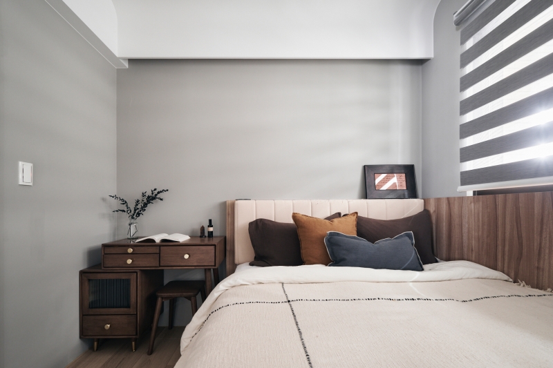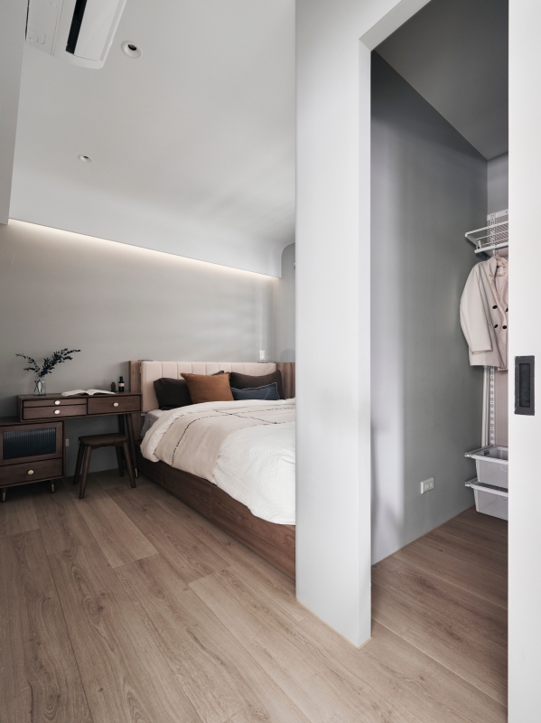 沙發後方為用餐、工作與聚會的複合空間,可調式燈源回應不同情境,收納櫃內整合清潔設備與貓咪餵食區,降低動線干擾。靠窗臥榻兼具儲物與休憩機能,順應貓咪喜愛停留觀景的特性。廚房以半穿透拉門隔絕油煙,櫃體下方打通與玄關連接,在料理時仍能察覺屋內動靜。主臥以沉靜色階與柔和間接光營造放鬆氛圍,包覆式床頭提供安定感。