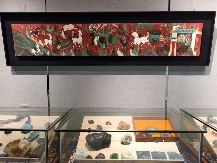 本次展覽以「石有靈,鷺有影,島有韻,彩有聲」為核心主題意象,用青金石、孔雀石、朱砂等天然礦物顏料素材,展現東方繪畫的材質之美與哲思,記錄了中國繪畫從傳統走向當代的轉型歷程。