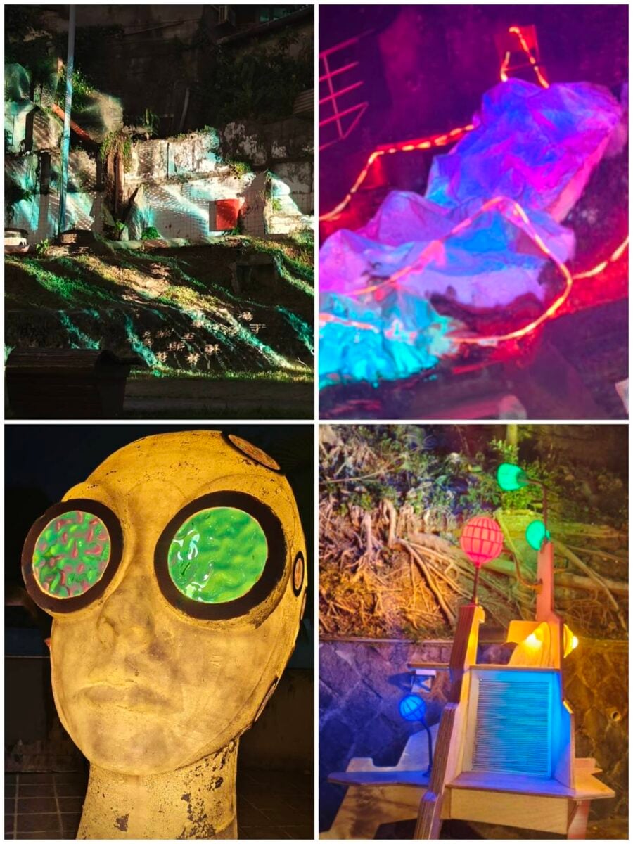 開幕晚間17:30,藝術家帶領貴賓與觀眾進行深度藝術導覽,分享創作理念與場域觀察。19:00主舞台「綠野地」登場聲光演出,由跨域音樂團體「PARTS LAB」以爵士即興融合電子節拍,呼應山城層層交錯的巷弄結構,音樂充滿整個夜晚,引導觀眾逐步走向山城核心,形塑象徵聚落甦醒的「人流上山」動態節奏。