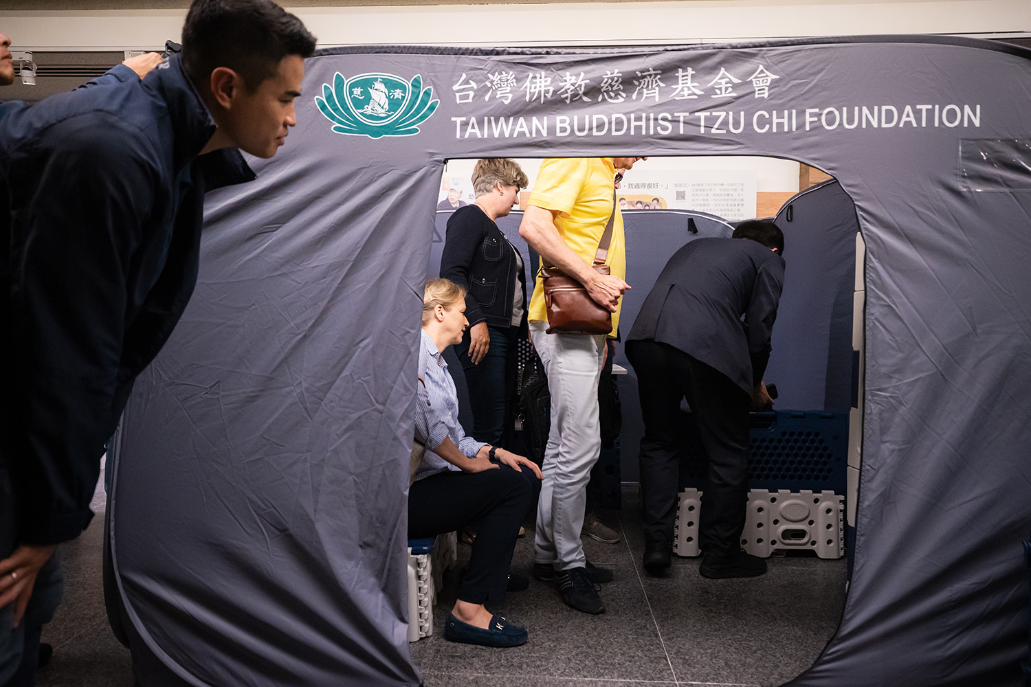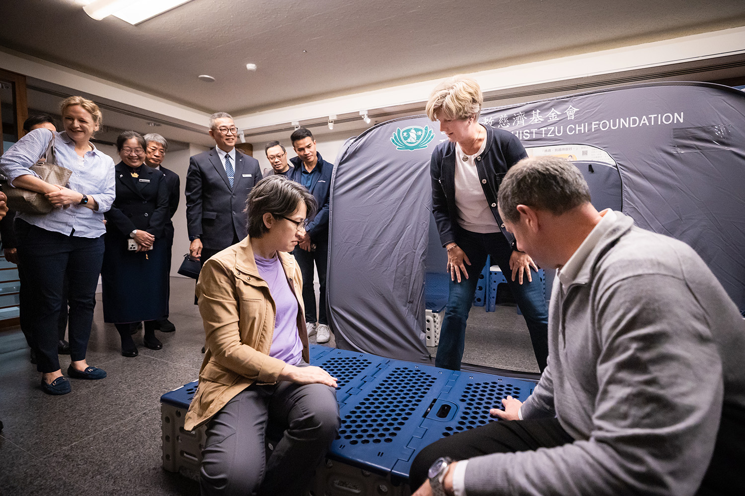 慈濟慈善事業基金會執行長顏博文致歡迎詞,迎賓人員有副執行長張宗義、慈濟大學校長劉怡均、副校長陳宗鷹、主任秘書温蕙甄等慈濟同仁與志工們,以及研發災民安置用品的蔡昇倫博士,展示可折疊、收納的工具,說明研發理念來自證嚴法師對災民的悲心與尊重。