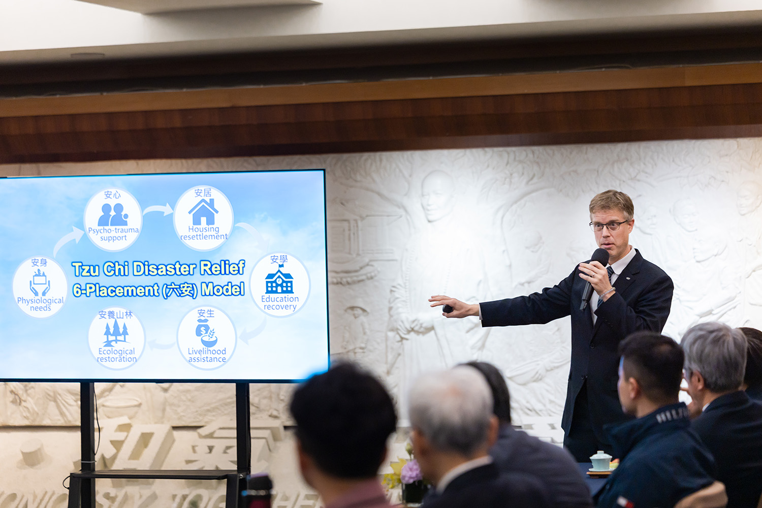 慈濟慈善事業基金會全球合作暨青年發展室專員歐友涵介紹慈濟,說明慈濟自創立以來,逐步拓展慈善、醫療、教育與人文志業,並與聯合國永續發展目標(SDGs)接軌。在救災部分,秉持「六安」原則:安身、安生、安心、安學、安養山林與安居,更因應受助者需求,研發各種防救災工具。以花蓮馬太鞍堰塞湖溢流事件為例,說明大規模動員與分工模式。自9月24日慈濟前往光復鄉勘災後,9月25日起慈濟志工投入清淤與關懷行動,並結合各界力量投入環境復原。面對上萬名救災人員湧入,慈濟除供應便當,更於光復車站前設置行動廚房,即時提供熱食,讓救災人員補充體力。針對認養清淤的區域,慈濟以圖資掌握進度、分配動線、調度人力等,期望在大量人力投入時有條不紊。