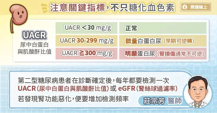 值得注意的是,有些糖尿病患者在eGFR還沒下降前,就已經出現尿蛋白,代表腎臟可能已開始受損。