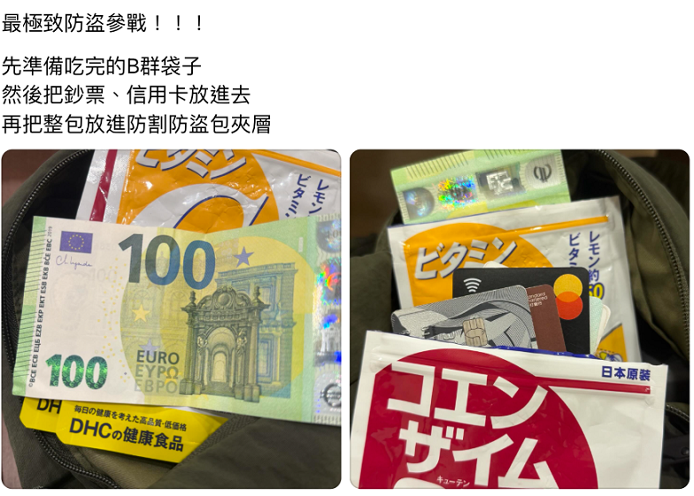 【記者 高鐿玲/台北 報導】隨著歐洲旅遊熱潮持續,防扒手成為台灣旅客行前準備的「必修課」。近日,社群平台Threads上出現一篇探討「極致防盜術」的貼文,短短時間內就狂吸近7萬次瀏覽與熱烈討論。原PO分享將百元歐元大鈔與信用卡,通通塞進「吃完的B群夾鏈袋」中,超狂的偽裝術讓大批網友笑瘋朝聖。