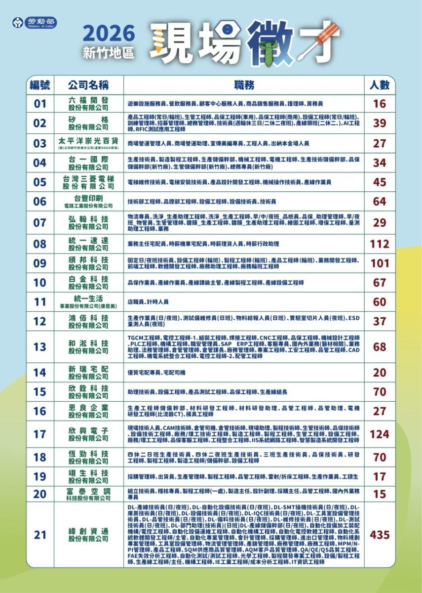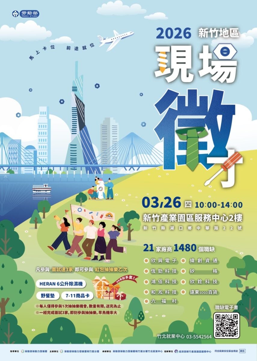 【記者 彭慧婉/新竹 報導】勞動部勞動力發展署桃竹苗分署將於3月26日(星期四)上午10點至下午2點,在新竹產業園區服務中心2樓(新竹縣湖口鄉中華路22號)舉辦「2026年新竹地區現場徵才活動」。本次徵才活動匯集科技製造、物流運輸與餐飲旅宿業等共計21家知名廠商,提供高達1,480個優質職缺,協助不同背景與職涯階段的求職者都能找到合適的工作。