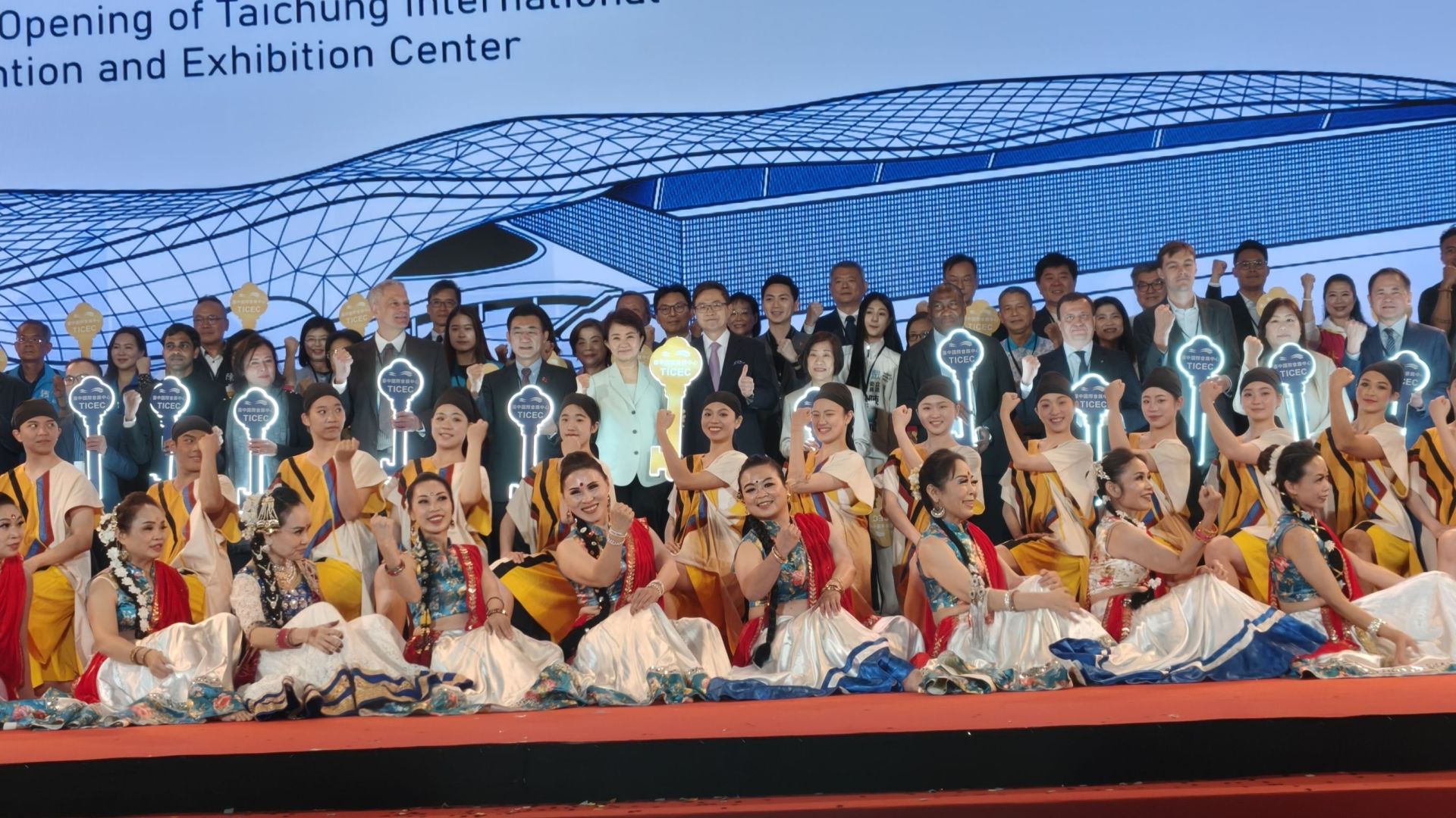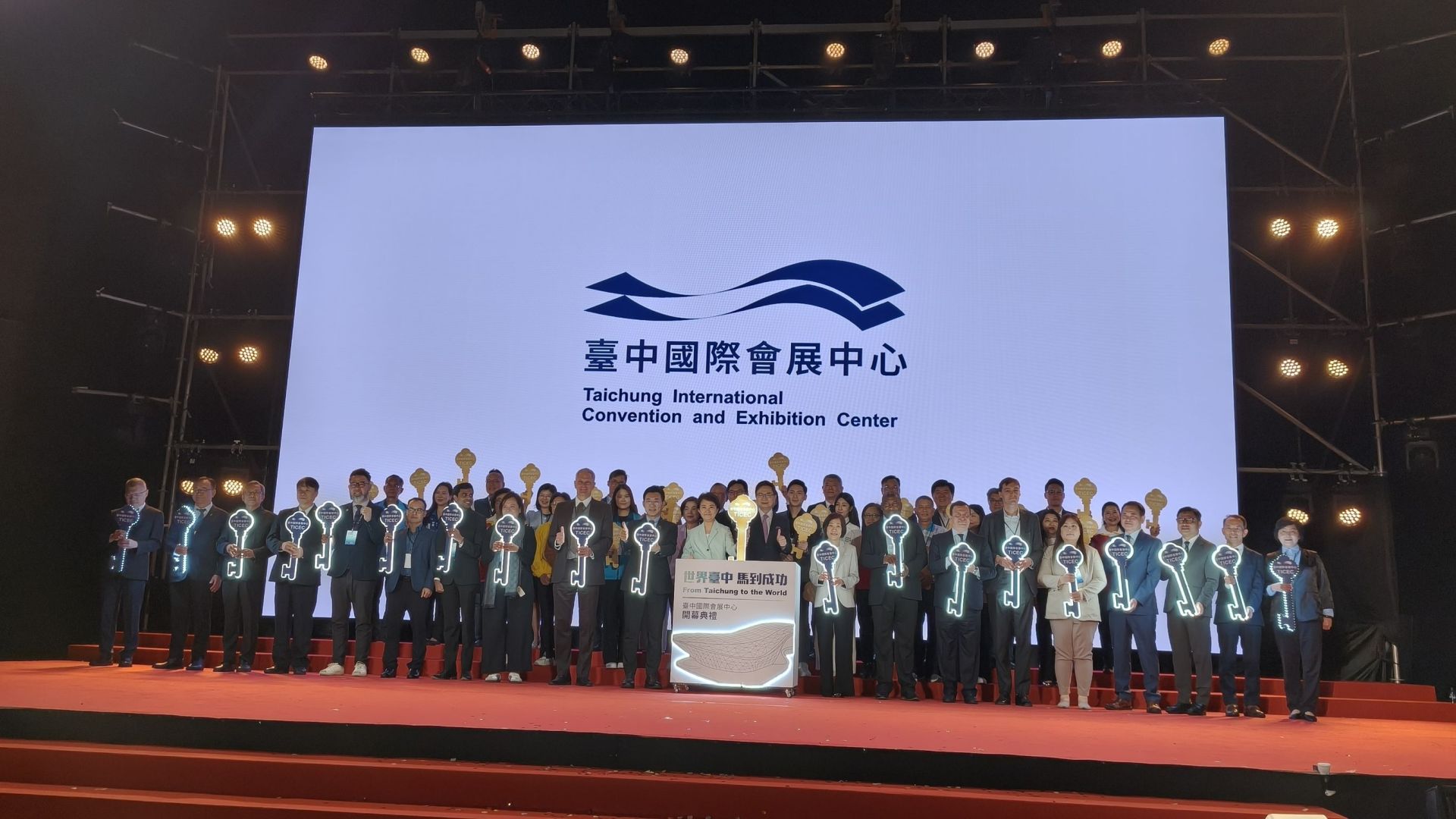 中台灣產業歷經20年殷切期盼擁有的國際級規格「台中國際會展中心」,今(23)日盛大舉行開幕典禮,市長盧秀燕率市府團隊,與營運團隊中華民國對外貿易發展協會董事長黃志芳、經濟部政務次長江文若、中台灣7縣市代表、台灣工具機暨零組件工業同業公會理事長陳紳騰、外國駐台代表、工商團體及產業各界領袖,共同見證會展場館正式開幕。