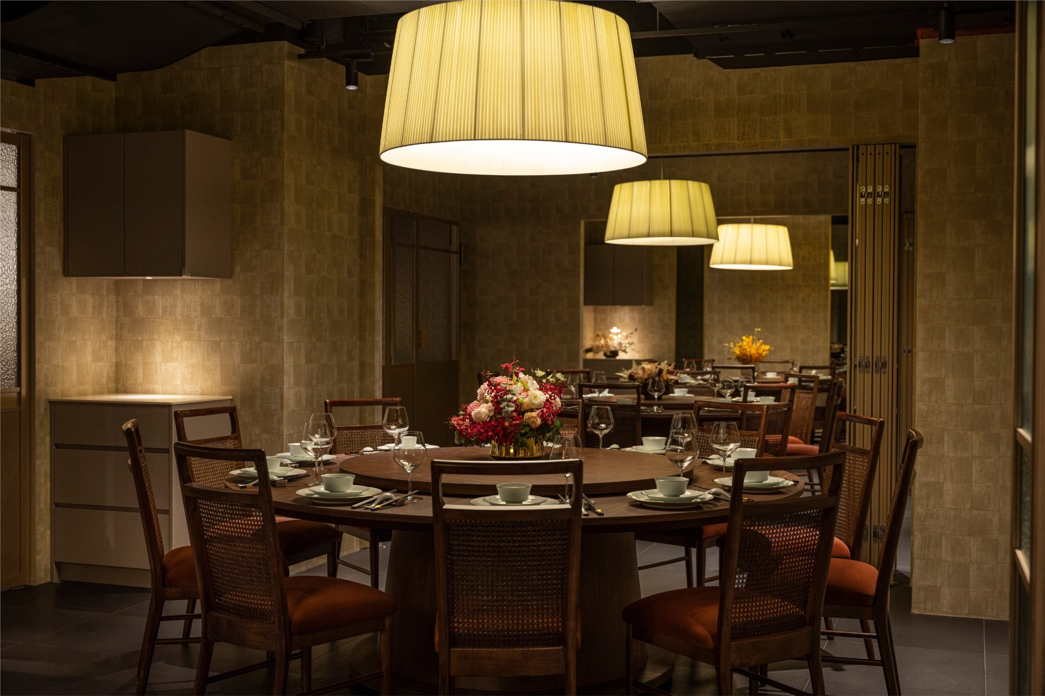 設計概念以「團圓(Reunion)」為主軸,除保留象徵共享的圓桌元素外,更以蛇形排列的訂製橢圓餐桌作為空間核心,讓雙人用餐、家庭聚會與多人宴席皆能自在切換,避免傳統大桌配置常見的空席尷尬。整體動線透過彈性隔間與包廂設計,能依尖峰與離峰時段靈活調整空間尺度,在開放感與私密性之間取得平衡。