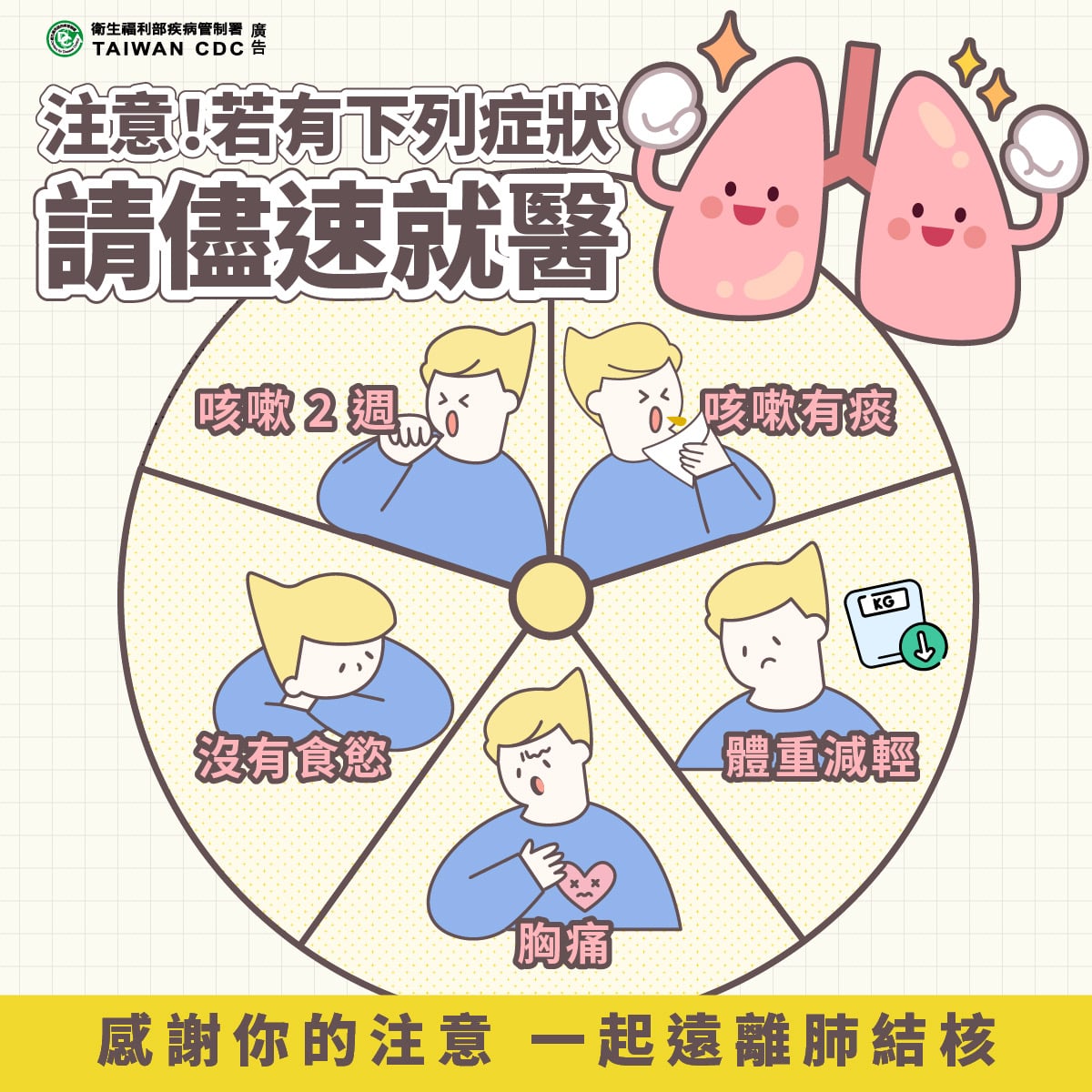 衛生局表示,當有咳嗽超過2週、胸痛、體重減輕、發燒等疑似結核病症狀,或胸部X光檢查結果異常,要立即就醫檢查。確診結核病一定要接受完整治療,依照醫師開立的治療處方規則服藥,結核病是可以治癒的。此外,潛伏結核感染代表體內已經感染結核菌,若沒治療未來可能會發病成為結核病,衛生局鼓勵民眾及早檢驗及早治療,避免結核病發病影響自身健康及傳播周遭親朋好友。