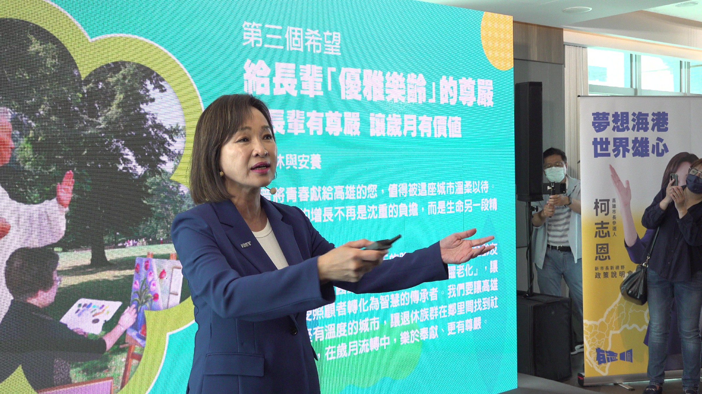 柯志恩以「夢想海港、世界雄心」作為核心理念,指出高雄過去長期面臨人才外流問題,許多年輕人北上發展,她更關注的是如何讓人才願意留下。她表示,未來將致力於打造一座有願景、有機會的城市,讓高雄不只是被守住,而是能持續吸引人留下發展。