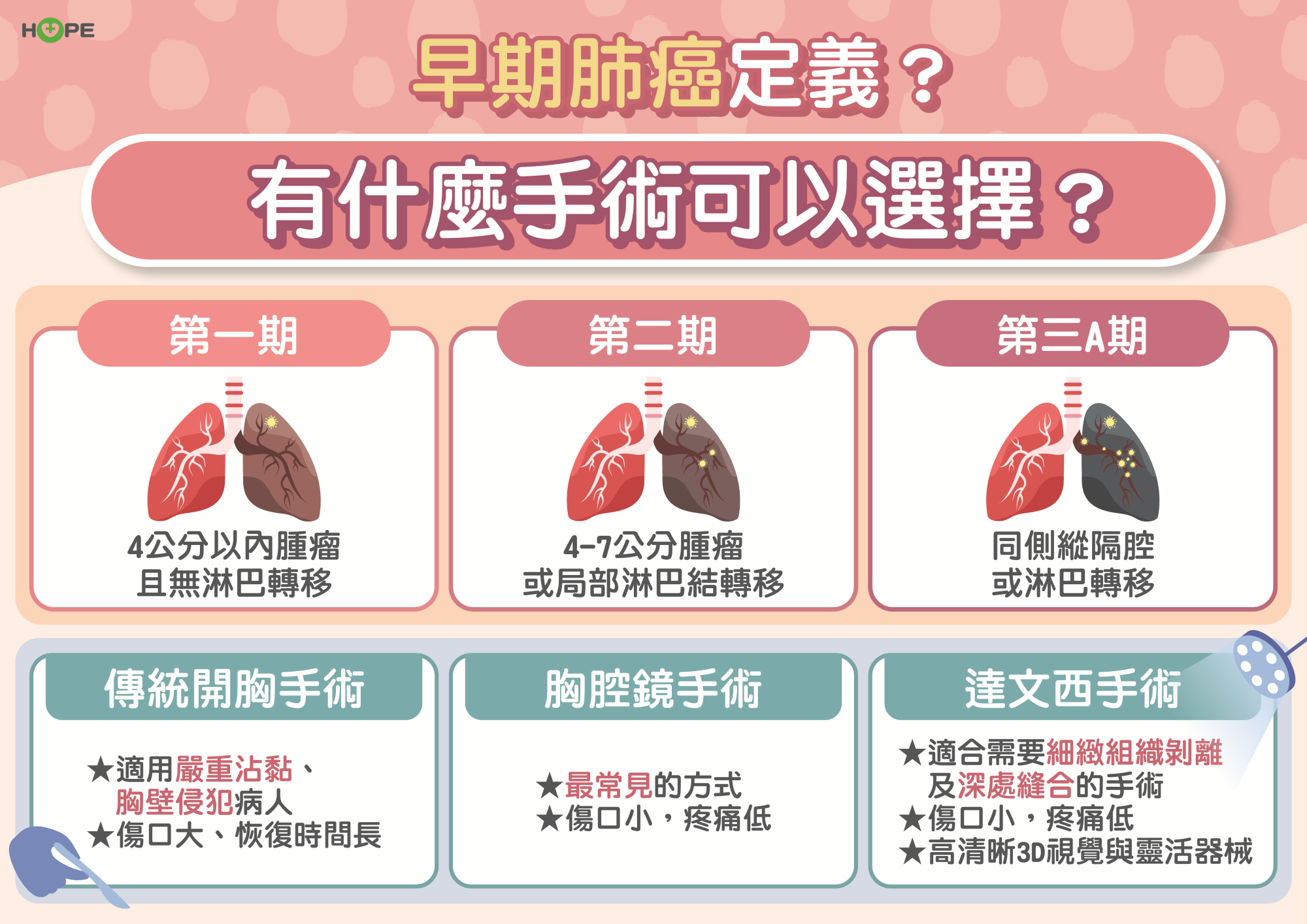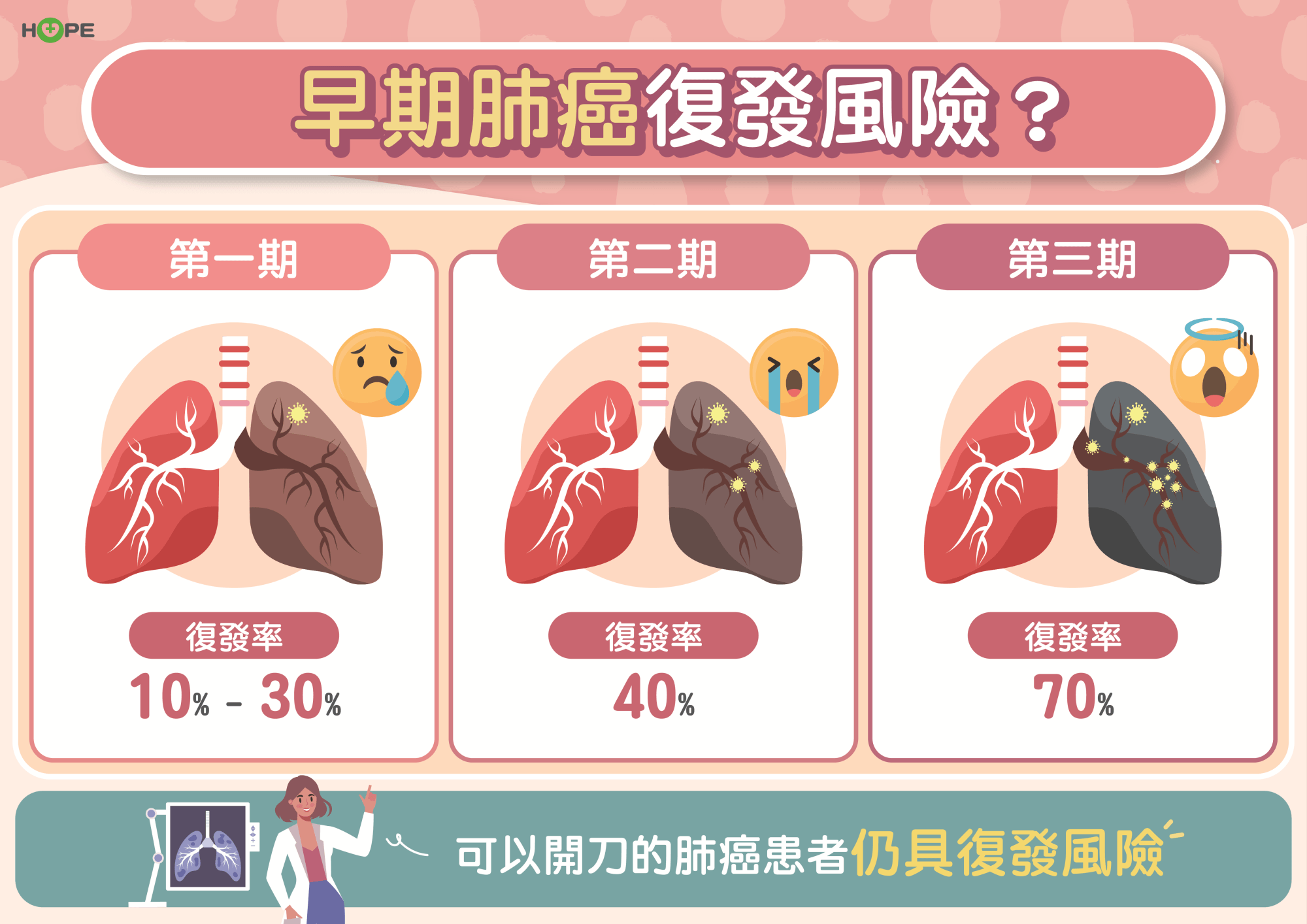 第一期到第三期A是早期肺癌。然而腫瘤越大復發機會越大,第一期肺癌復發率為10-30%,第二期復發率為40%。第三期的復發率高達70%,存活率僅剩下二成左右。