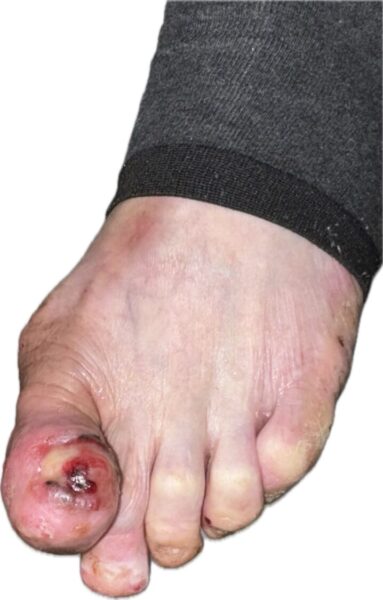 高雄一名 76 歲的林姓婦人,因腳趾甲旁反覆紅腫、化膿且長出肉芽腫,甚至嚴重到無法穿鞋走路。婦人原以為只是難纏的「慢性甲溝炎」,一年多來四處求診卻未見好轉,最後至高雄醫學大學附設中和紀念醫院(以下簡稱高醫)求診,經整形外科黃書鴻教授視診,敏銳察覺其病灶外觀有異,立即進行皮膚切片檢查,確診為惡性程度極高的「肢端黑色素癌」第二期。為防止癌細胞擴散及精準臨床分期,醫療團隊隨即進行正子掃描(PET)、大腳趾截肢手術及前驅淋巴結切片手術。並同步照會皮膚科及血液腫瘤科,共同規劃術後免疫治療方案。目前術後恢復良好,讓原本深受病痛折磨的婦人感激直呼:「還好醫師及時揪出病灶,才保住一命。」