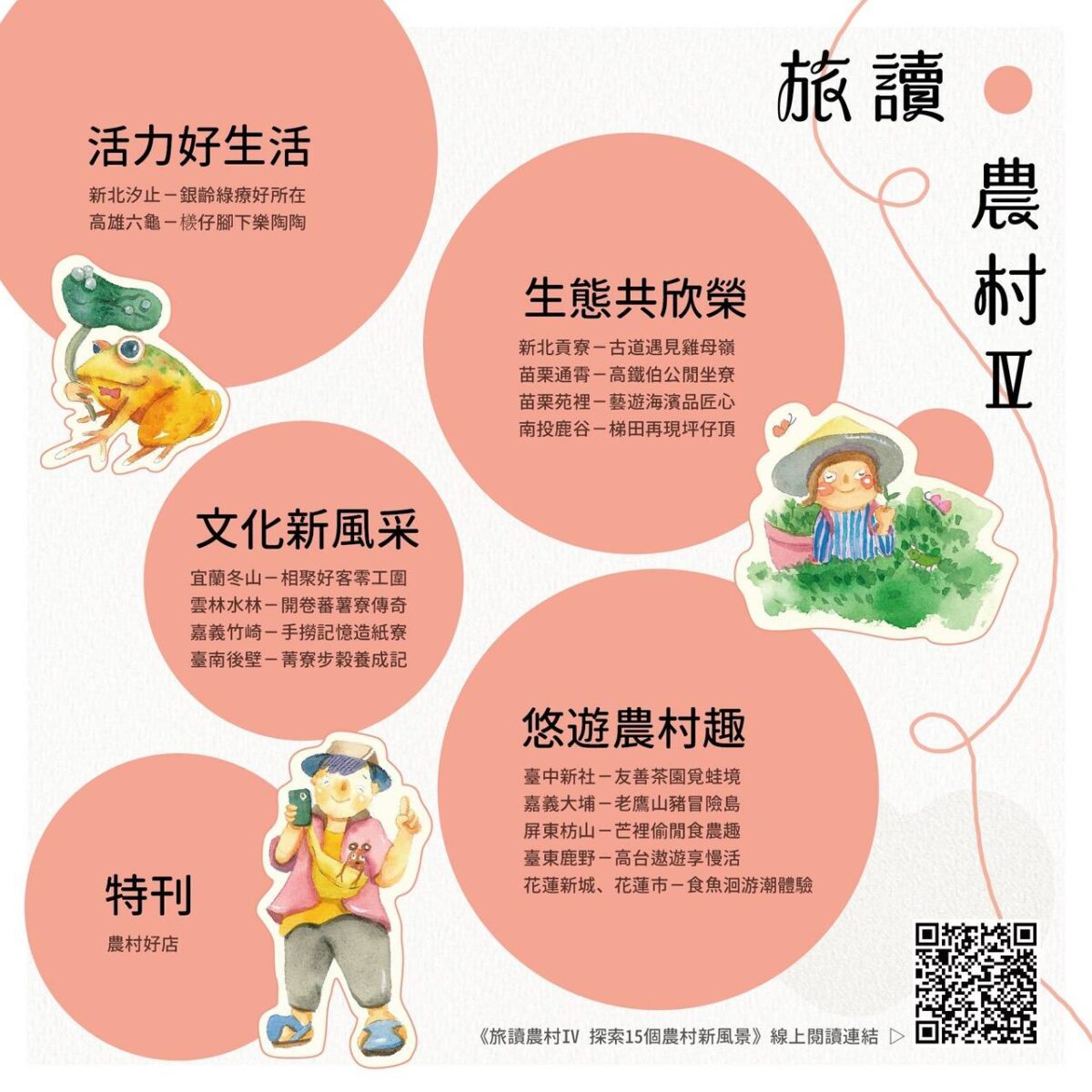 【記者 謝雅情/南投 報導】《旅讀農村》系列書籍精選全臺農村環境營造成果,以活力好生活、生態共欣榮、文化新風采及悠遊農村趣四大特色主題,搭配「旅人走讀」視角,帶領讀者按圖索驥、走進臺灣農漁村,細看在地社區、設計團隊等單位如何以生活、生產及生態等面向為核心,結合綠色照顧、食農教育等理念,打造宜居宜業宜遊的永續新農村。