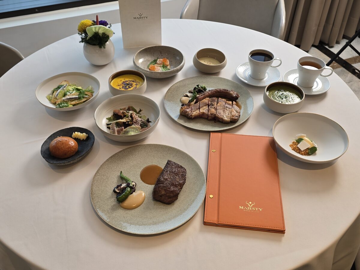 菜單設計從前菜到甜點層層鋪陳,包含風味濃郁的風乾火腿沙拉、口感滑順的蔬菜濃湯,以及結合白酒奶油醬與鮭魚卵的香煎干貝等精緻料理,展現法式料理講究的細節與平衡。主餐則提供多元選擇,涵蓋頂級牛排、風味濃厚的肉類料理及新鮮海味,透過精準火候展現食材最佳狀態。餐後搭配精緻甜點與飲品,為整體用餐體驗畫下優雅句點。