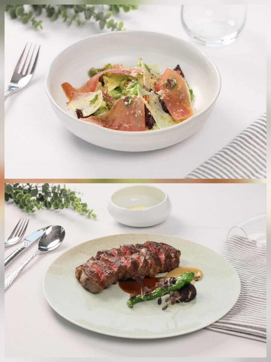 ▲「西班牙塞拉諾風乾火腿沙拉」以鹹香濃郁的風乾火腿搭配爽脆生菜與清新油醋,口感輕盈開胃、「美國頂級肋眼」嚴選美國高品質Prime級牛肉,從選肉、熟成到火候掌控皆講究細節。