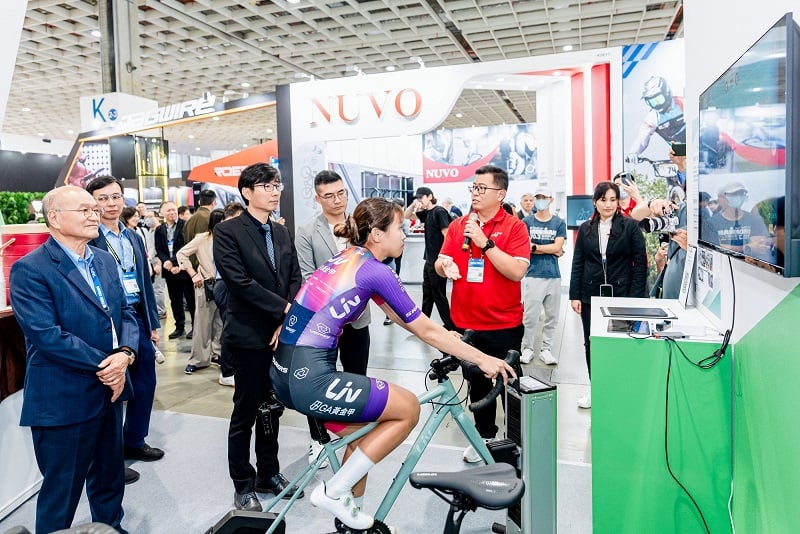 ▲職業車手在經濟部自行車產業主題館展現運動科技如何提升訓練與運動表現。