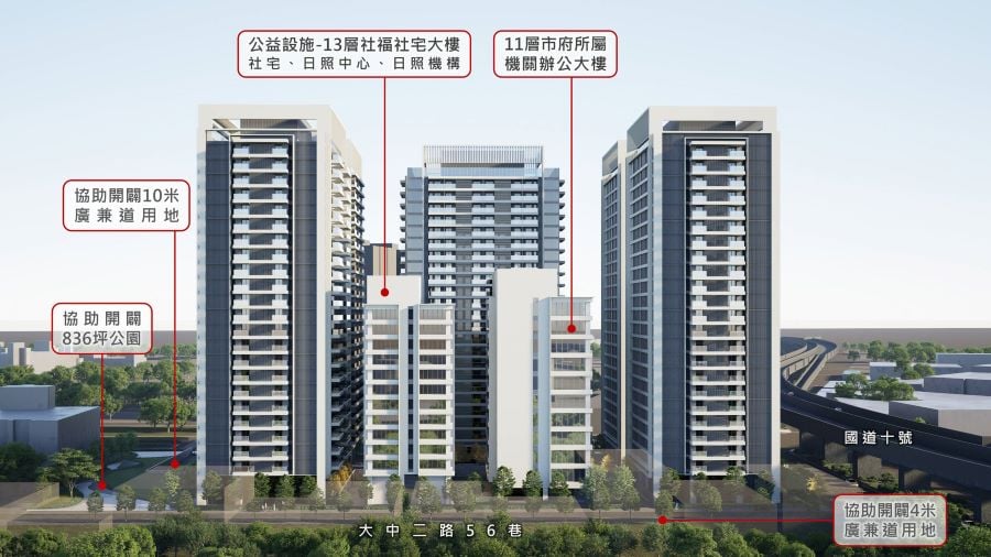 林副市長強調,更新後市府將分回A棟全棟住宅單元264戶、B棟部分住宅160戶、4戶店鋪、323個停車位,另外還有一棟全新、面積計約2,245坪的綜合辦公大樓,讓在原址辦公的工務局公園處、道路養護工程處及道路挖掘管理中心等機關進駐;同時,規劃全棟社會福利大樓,提供約 85戶的社會住宅、閱覽空間、社區型日照中心、日照機構等社福設施,完善區域公共服務機能。為讓在地居民及早享受都市更新帶來的實質效益,市府特別要求實施者先行開闢基地北側836坪公園。公園動土不僅是一個美好的開端,都更單元全區也預計於今(115)年10月全面動工,未來住宅大樓周邊將再增加1230坪開放空間,透過系統性的綠意步道與今天動土的836坪公園相結合,屆時將為當地居民創造超過二千坪以上綠意休閒場地。