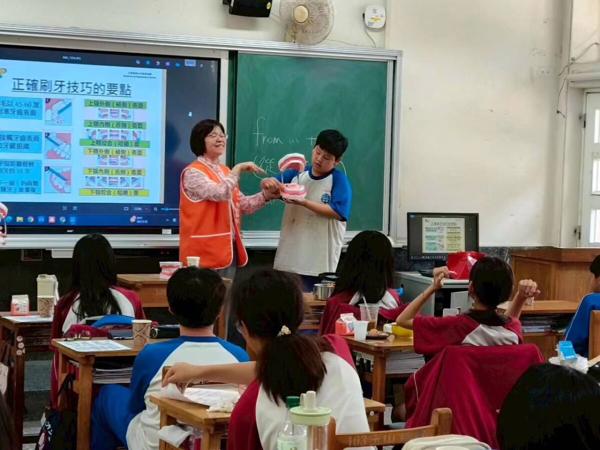 ▲玉山國中學生於課堂中即時回應示範教學,依指導操作刷牙與牙線技巧,展現專注學習態度與良好互動表現。