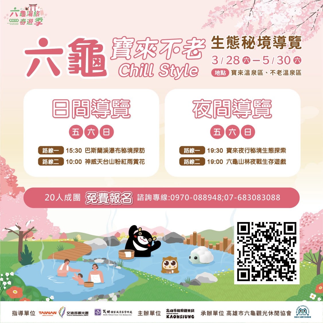 觀光局長高閔琳表示,六龜不僅擁有花旗木、梅花與優質溫泉資源,同時也是高雄原生山茶的重要產地。今年「六龜湯旅春遊季」推出四條生態秘境導覽遊程,主打日夜雙體驗,帶領遊客深度探訪六龜。白天有凹豆(outdoor)咖最愛的「巴斯蘭溪瀑布秘境探訪」,遊客沿著巴斯蘭溪順行,欣賞獨特的「斷層崖」溪流地形及豐富的生態環境;網美行程則有「神威天台山粉紅雨賞花」,徜徉於粉紅色花海裡恍如仙境;夜晚首次推出「六龜山林夜戰生存遊戲」,將山林場域轉化為具情境感的「夜間行動舞台」,結合沉浸式情境體驗,打造夜遊新亮點;「寶來夜行秘境生態探索」則帶領遊客走入歷史悠久的戰道遺址,探索夜間生態之美,各項導覽活動自即日起開放線上報名(https://www.accupass.com/event/2603170738021574758603)。