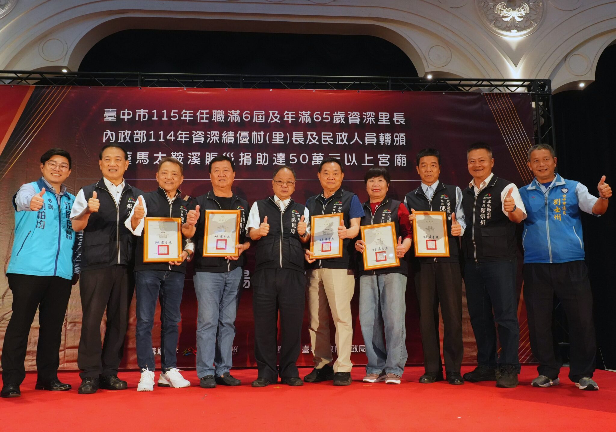 【民眾網諸葛志一臺中報導】為感謝基層人員長年付出及宗教團體熱心公益,台中市政府民政局 25日晚間舉辦「感恩有您,榮耀同行」表揚活動,表彰全市48位任職滿6屆且年滿65歲的資深里長,以及捐助花蓮馬太鞍溪賑災善款逾50萬元的7間宮廟代表,並轉頒內政部114年資深績優村(里)長及民政人員獎項。