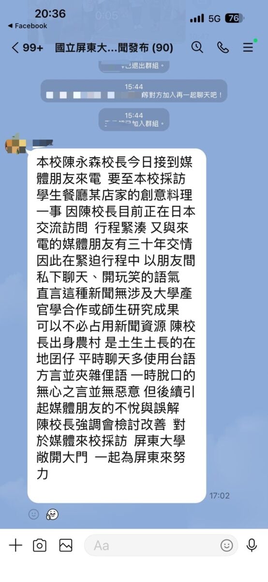 ▲屏東大學媒體群組發文表示,陳校長一時脫口的無心之言,並無惡意。(圖/翻攝自屏東大學官網LINE群組畫面)