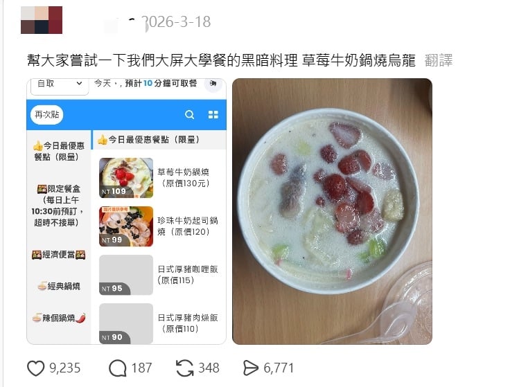 ▲屏東大學學生在網路PO文分享學校的草莓牛奶鍋燒烏龍。(圖/翻攝Threads畫面)