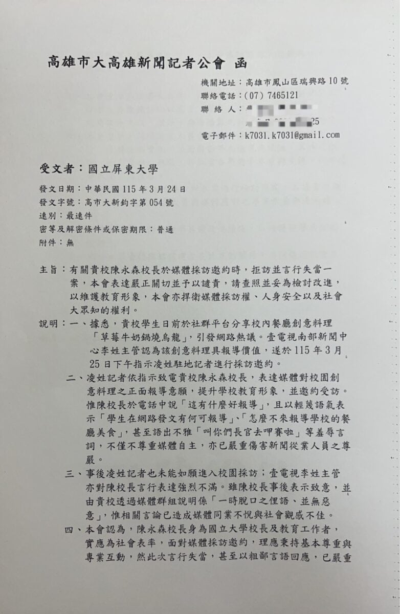 【記者 王苡蘋╱屏東 報導】國立屏東大學學生在脆發文分享,校內餐廳有黑暗料理「草莓牛奶鍋燒烏龍」,引發網友廣大討論,壹電視南部新聞中心李姓主管,認為此創意料理相當有趣,3/25下午請凌姓駐地記者聯繫校方。凌姓記者致電屏東大學,向校長陳永森表示此校園創意料理很有趣,電視台想約訪報導,陳姓校長卻在電話中說「這沒什麼好報導的」,並用輕蔑態度回覆,「學生在網路po文,沒什麼好報導,怎麼不來拍我們的校園餐廳,叫你們長官去呷賽啦!」。