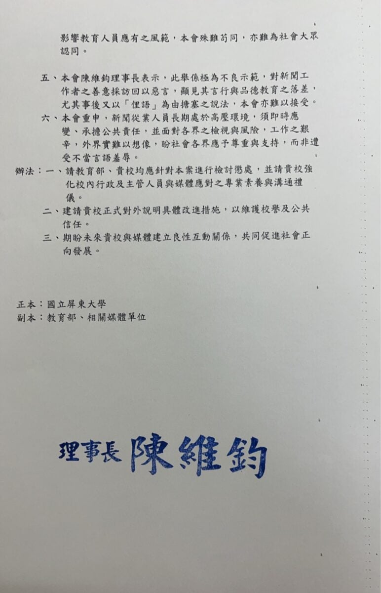 對於邀約採訪正面美食新聞,卻被校長輕蔑說去吃排泄物,駐地記者感到非常不受尊重,李姓主管對於校長的失言也感到憤怒,並在臉書發文說「堂堂國立屏東大學的校長 接到記者約訪電話 竟然叫人去吃大便 真的是夠了」。