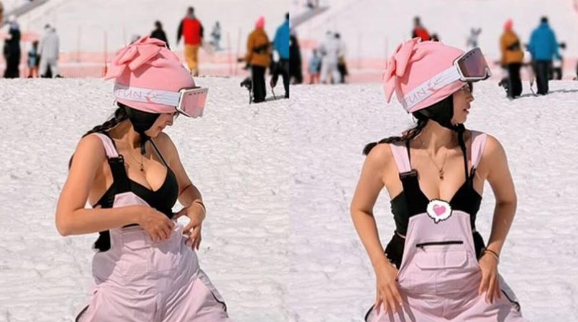 照片中,阿喜將粉色吊帶褲拉下,露出黑色bra top,大方展現身材曲線。不過畫面曝光後,評價兩極,有人質疑滑雪場為親子活動場所,不適合拍攝性感照片,也有人直言外國人在日本應更注意文化觀感。