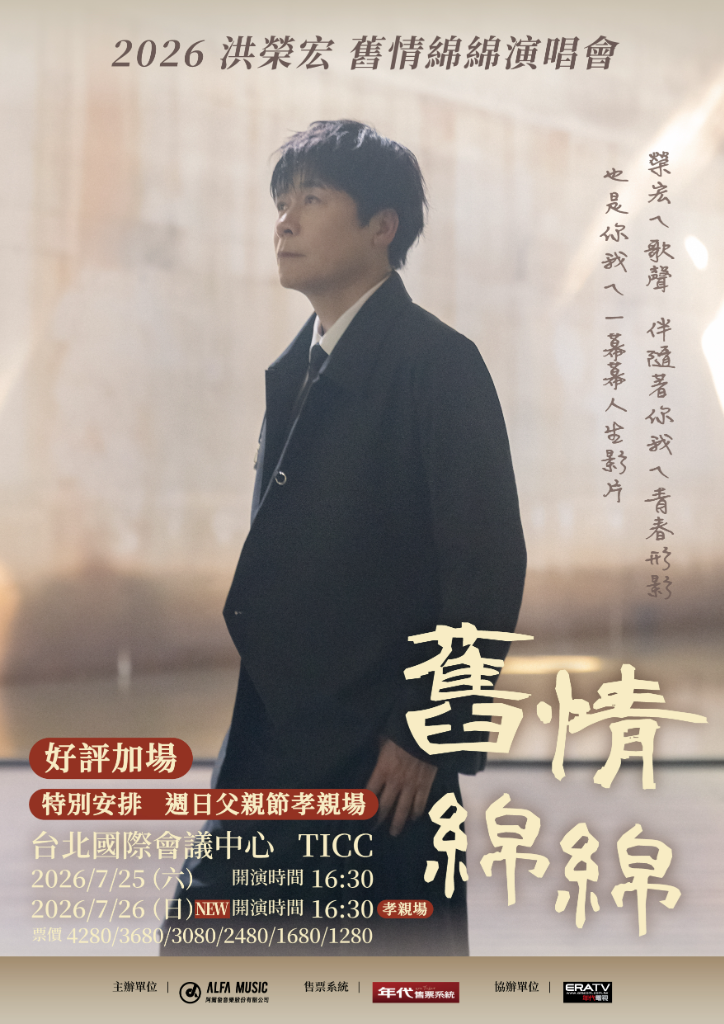 洪榮宏將對父親的思念轉化為舞台動力,宣布「舊情綿綿」演唱會孝親加場將於7月26日登場,門票預計3月27日中午12點於年代售票系統開賣。