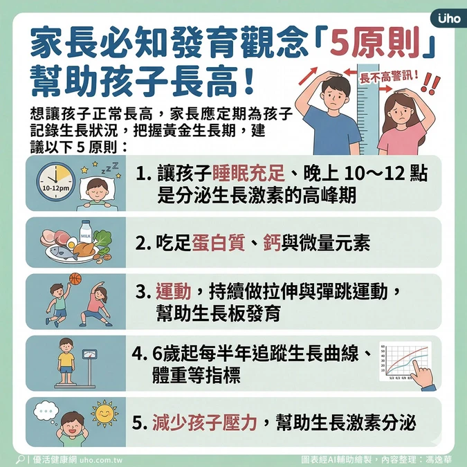 童怡靖說明,想讓孩子正常長高,家長應定期為孩子記錄生長狀況,把握黃金生長期,可從充足睡眠、均衡飲食及培養運動習慣著手,並建議以下5原則: