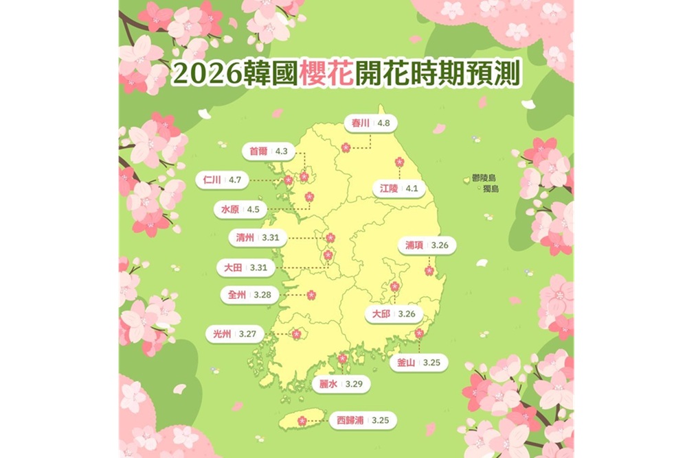 韓國觀光公社台北支社表示,在眾多春季亮點之中,最受期待的仍然為象徵季節轉換的櫻花景色,春日腳步悄然來臨,2026年韓國櫻花預測,也在近日出爐。預計3月25日起從濟州、釜山一帶為起點,並一路向北延伸,一直至4月中旬,韓國各地將遍佈滿滿春日氣息。今年,特別整合中部重點城市與特色行程,不僅能避開人潮,搭配各地期間限定的節慶活動和文化體驗,更讓旅程不再只是單純走訪景點,而是一場深入地方魅力的感官探索。