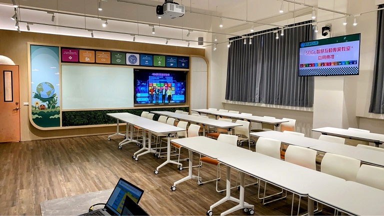 ▲斥資打造的「SDGs智慧互動專業教室」,全面導入環境控制與語音控制系統,是一間高度智能化的學習空間。