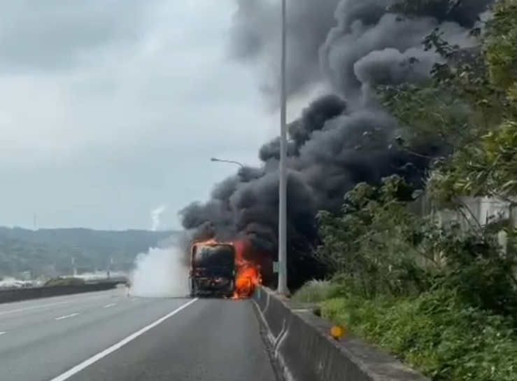國道1號遊覽車失火濃煙沖天火勢猛烈。