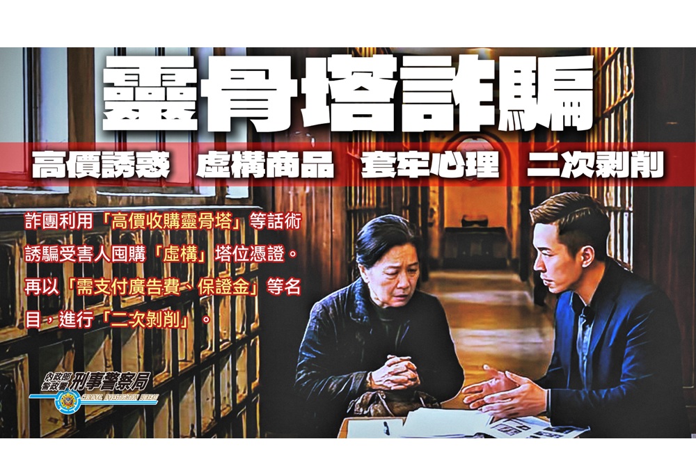 刑事局呼籲,詐騙集團常以靈骨塔權狀鎖定持有人,謊稱有買家高價收購甚至假冒特定知名公廟或公司,誘使被害人先行支付保證金、稅金或相關費用,並營造即將成交假象,最終拖延或破局詐財。