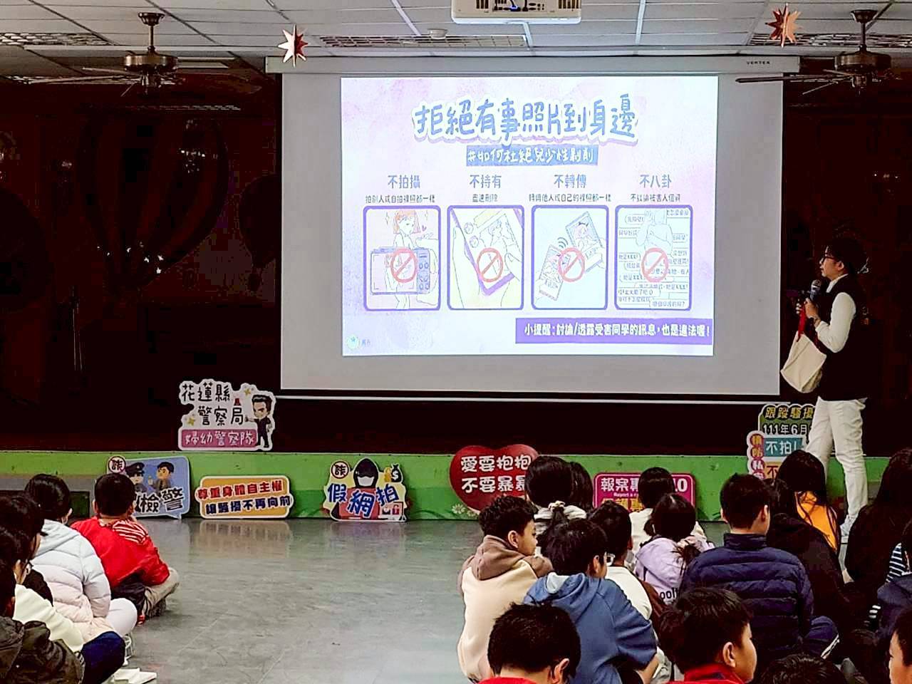 【民眾網編輯方笙楠花蓮報導】「跨局處數位性別暴力防治宣導講師團」成立已滿1年,由花蓮縣政府教育處、社會處、原住民行政處與花蓮縣警察局等多個單位共同組成,以保障兒少身心健康發展、避免遭人誘騙拍攝性影像為目標。新的學期開始,花蓮縣警察局婦幼警察隊前往太昌國小進行數位性別暴力防治及反詐騙宣導,期望在校園築起一道防護牆,讓孩子在無憂的環境下學習。