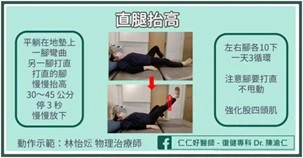 1. 直腿抬高(強化大腿,減輕膝蓋負擔)