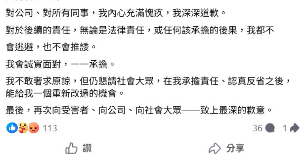 最後,再次向受害者、向公司、向社會大眾一一致上最深的歉意。