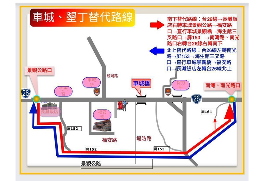 恆春警方表示,針對轄區易壅塞路段,例如在車城地區的替代道路:台26線主線道路壅塞時,南下遊客車輛,可自車城鄉海口長灘飯店路口,右轉屏152線後,接屏153線至南灣南光路口右轉南下;北上返程車輛,則可由台26線南灣南光路口,左轉接屏153線後,至屏152線車城鄉海口長灘飯店路口,左轉台26線繼續北上。