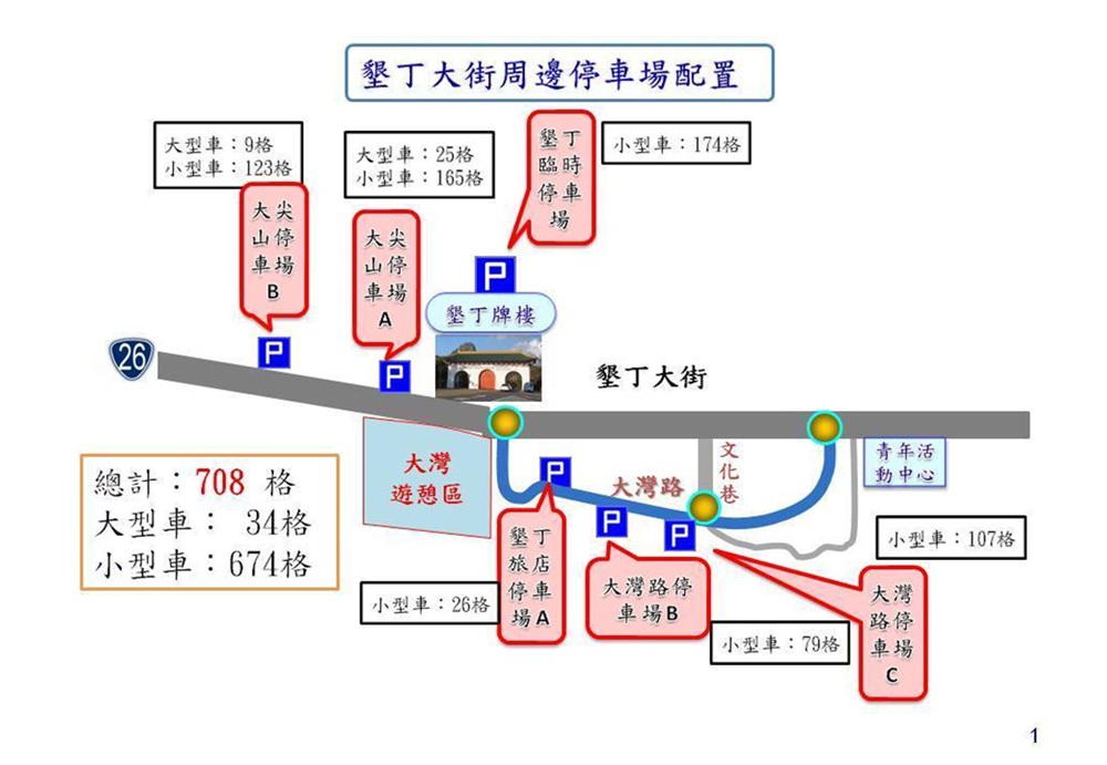 警方表示,管制期間,大灣路段兩側禁止停車,墾丁大街周邊道路停車場,可供大型車輛停車處計34位、小型車停車處計約674位,共計708位。大灣路兩側擺設改道牌,避免車輛路邊停車導致交通壅塞;道路兩側留有行人通行空間,請行人勿隨意跨越或移動改道牌,以免發生危險。