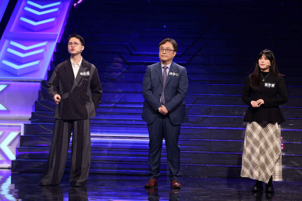 ▲ 主持人哈林(左)隨模仿張學友的楊昇達(右)節目上一搭一唱,安乙蕎(中)笑到不行。(圖:公視)