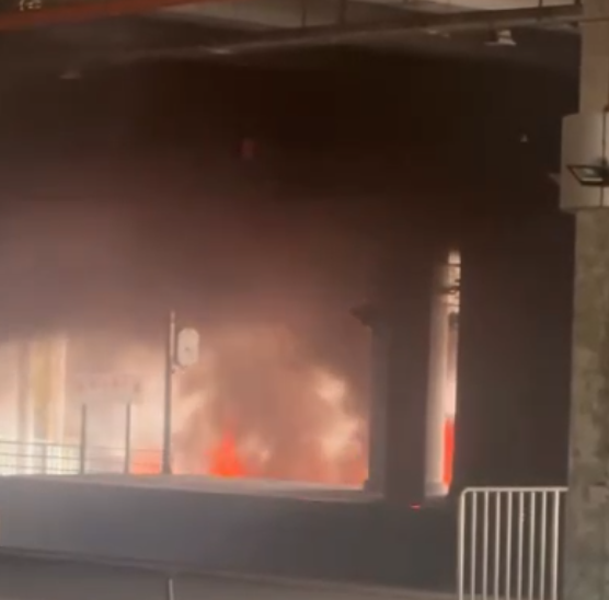台鐵新烏日站旁的回收場燒廢棄物,現場火勢沖天,車站內清晰可見烈焰。翻攝畫面