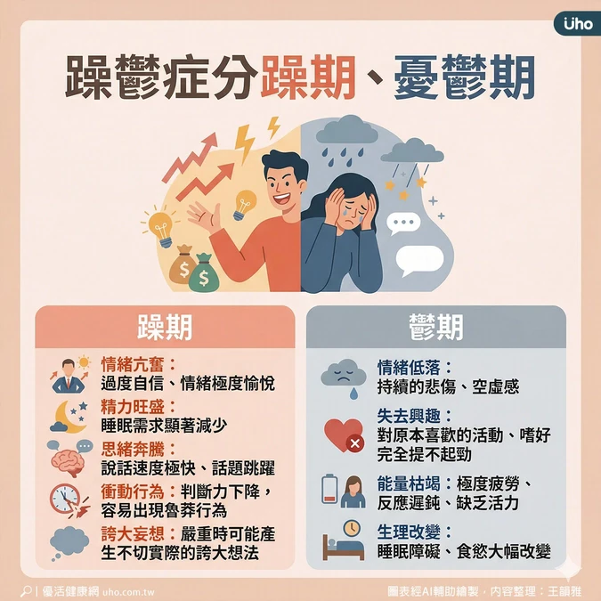 何儀峰指出,躁鬱症分成「躁期」與「鬱期」,躁期是情緒異常高昂或易怒,患者會出現情緒亢奮與衝動行為;鬱期則是情緒陷入重度低谷,患者會經歷類似重度憂鬱症的症狀。