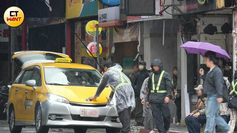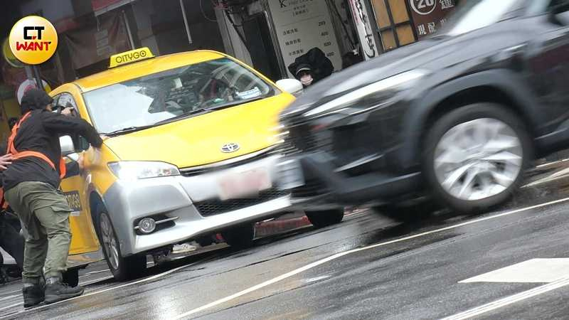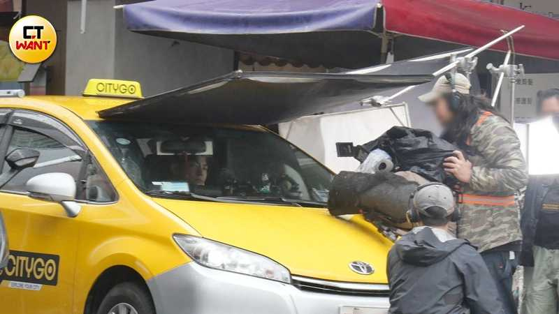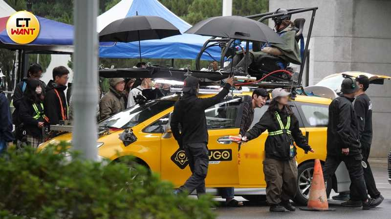 只見計程車頂加裝了一個如同賽車座艙的特殊設備,方向盤、油門、煞車與排檔等控制元件一應俱全。專業技術人員戴上安全帽、繫好安全帶,坐在車頂幫飾演司機的王柏傑「代客駕駛」,而王柏傑只需坐在駕駛座演出開車的模樣。這樣的專業分工,畫面極其罕見,若非「不得已」的因素,還真沒什麼機會能夠見識如此特殊的拍攝方式,讓人開了眼界。