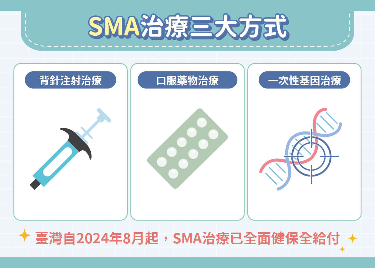 隨著醫學進展,SMA治療近年迎來重大突破。目前已有三大治療方式,包括脊髓腔注射、口服藥物,以及一次性的基因治療。而臺灣2024年已全面擴大健保給付,讓原本昂貴的療法不再遙不可及。這樣的改變,使SMA從「無法治療」,轉變為「可以介入、可以控制」的疾病。