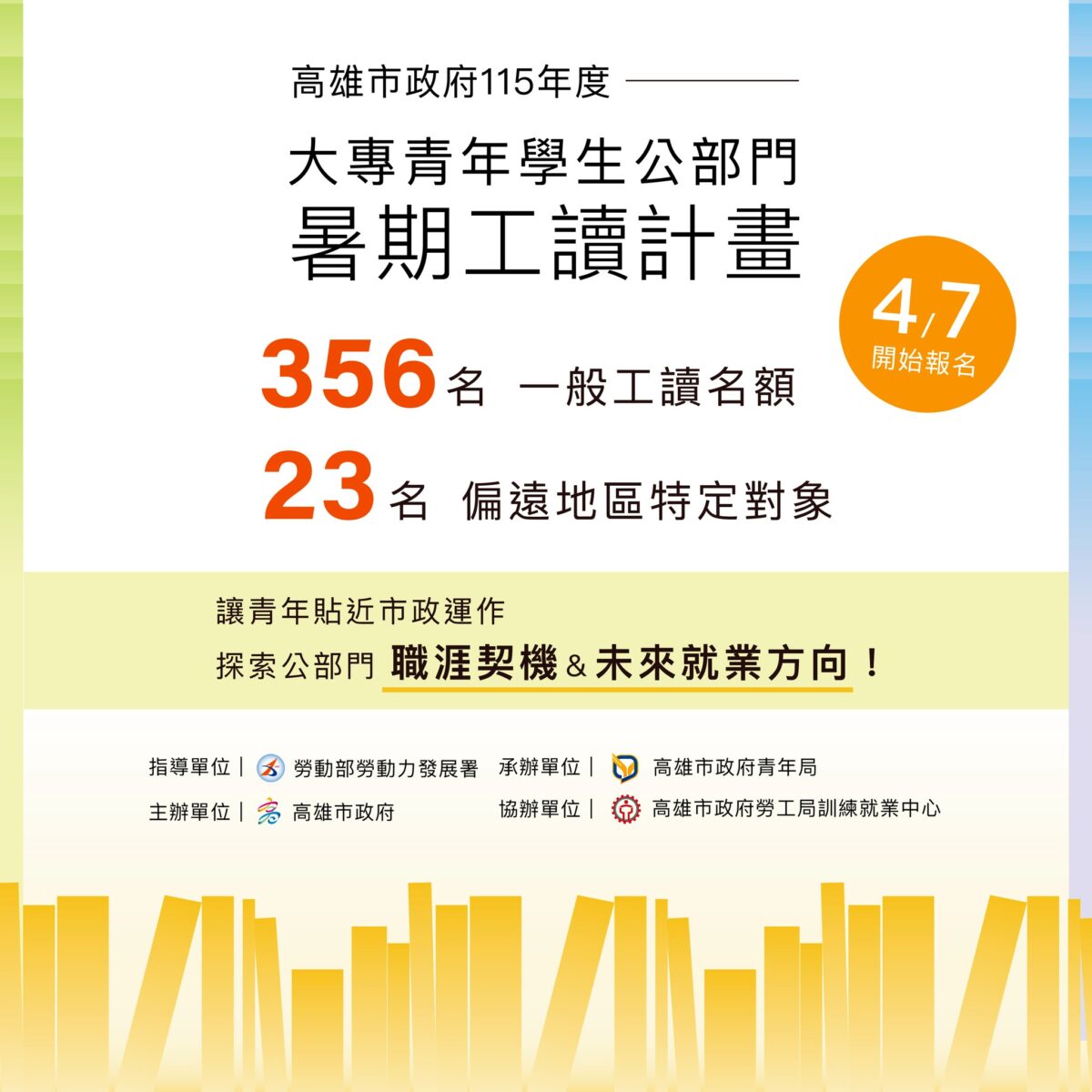 【記者 王苡蘋╱高雄 報導】想提早累積職場實務,一探公部門運作的幕後實況嗎?115年度「大專青年學生公部門暑期工讀計畫」於今(1)日正式公告,共有29個市府局處釋出379個職缺名額,4月7日至4月20日開放報名。今年首度採行線上或紙本送件雙軌報名機制,並延長報名時間,不僅簡化流程,更擴大青年參與公部門實務歷練的機會,讓暑期成為探索職涯方向與深化青年參與公共事務的重要起點。
