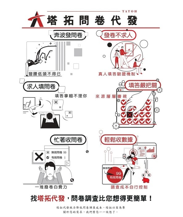 塔拓資訊有限公司提供研究與市場導向之問卷代發服務,專注專業流程、精準觸及與品質可用性,協助委託方取得可分析數據,支援研究與決策。 (圖/業者提供)
