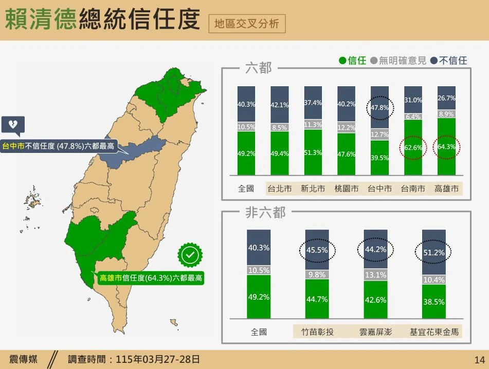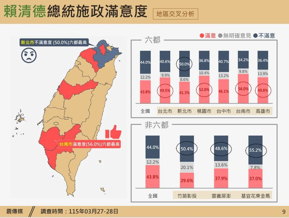 在地區交叉分析六都部分,台南市56.0%滿意度六都最高、新北市50.0%不滿意度六都最高。滿意度高於全國較多者:70歲以上;國中以下學歷,對賴清德滿意度逾五成,不滿意度高於全國較多者:20-39歲、50-59歲;專科及大學學歷。