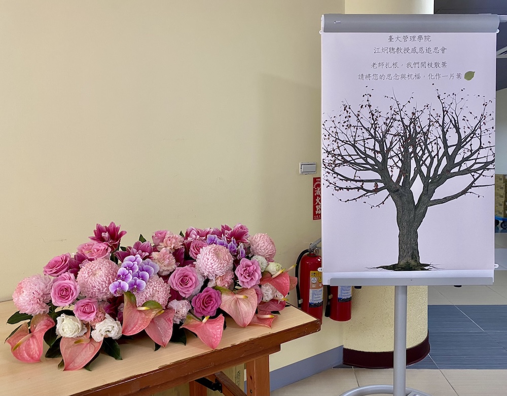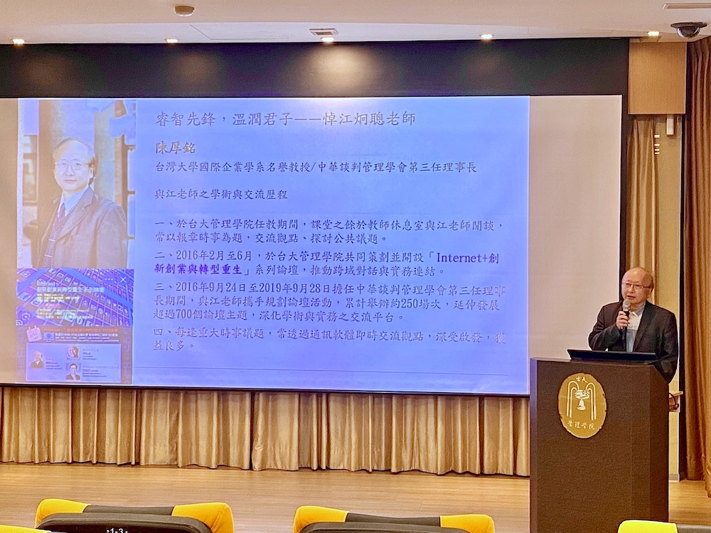 慧觀法師引用弘一大師《人生之最後》,闡述「讚嘆善業」的生命意義;花蓮慈濟醫院副院長吳彬安示範讚歎江老師法號「淨提」之善業,並領唱送別之曲,由楊雅惠教授鋼琴伴奏,場面莊嚴動人。在追思致詞環節,多位學界與企業界代表依序發言,包括台大管理學院院長、EMBA教授、企業領袖及長年合作師友,從不同角度回顧江教授在學術、教育與公共領域的卓越貢獻。與會者一致指出,江炯聰不僅是卓越學者,更是跨界整合與公共知識推動的重要引領者。