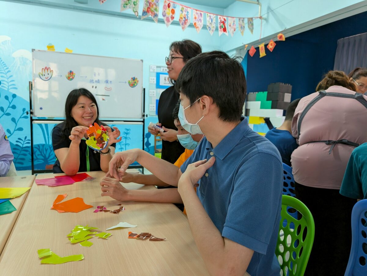 ▲台電高雄區處業務副處長許佳玉(左1)與照顧中心的星兒們一起做手掌撕貼創作。