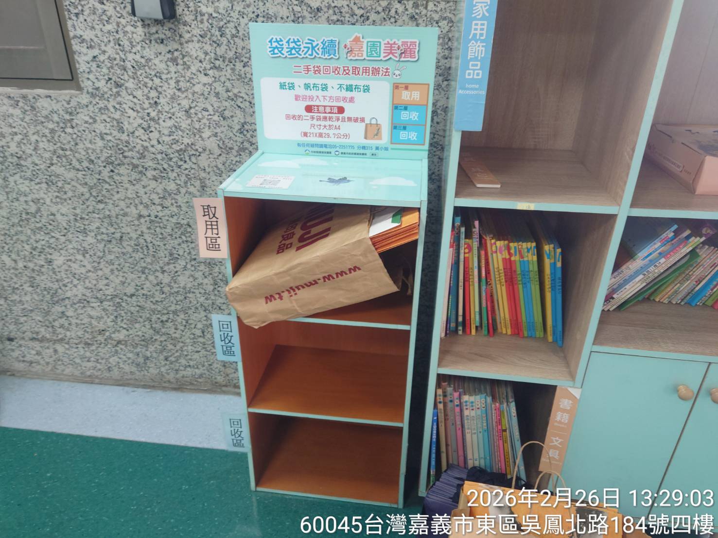 ↑圖說:嘉義市設置28處二手袋回收及取用處,以供急需袋子裝東西。(圖片來源:嘉義市建設處提供)