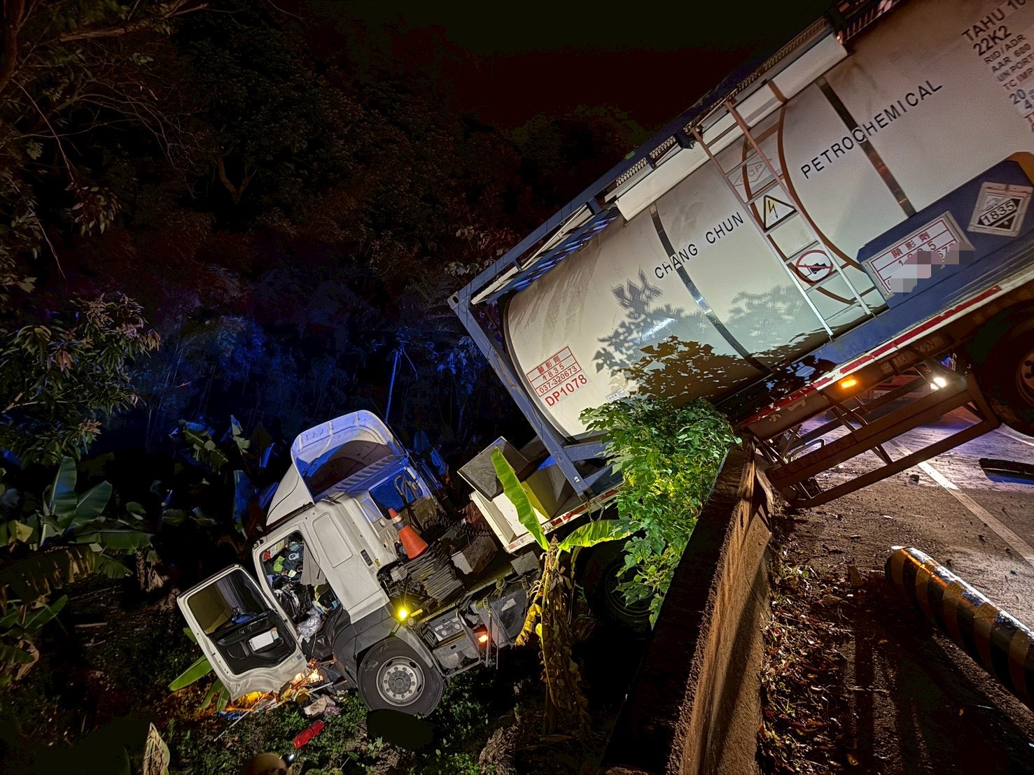 今天凌晨1日3時40分許,張姓男子(35歲)駕駛槽車沿經國路六段東往西直行至至公路口,不明原因自撞路邊護欄後險衝出護欄外,張男受傷經救護車送醫就治,駕駛經酒精檢測無飲酒情形,事故現場造成電桿斷落電線垂落路中影響交通。